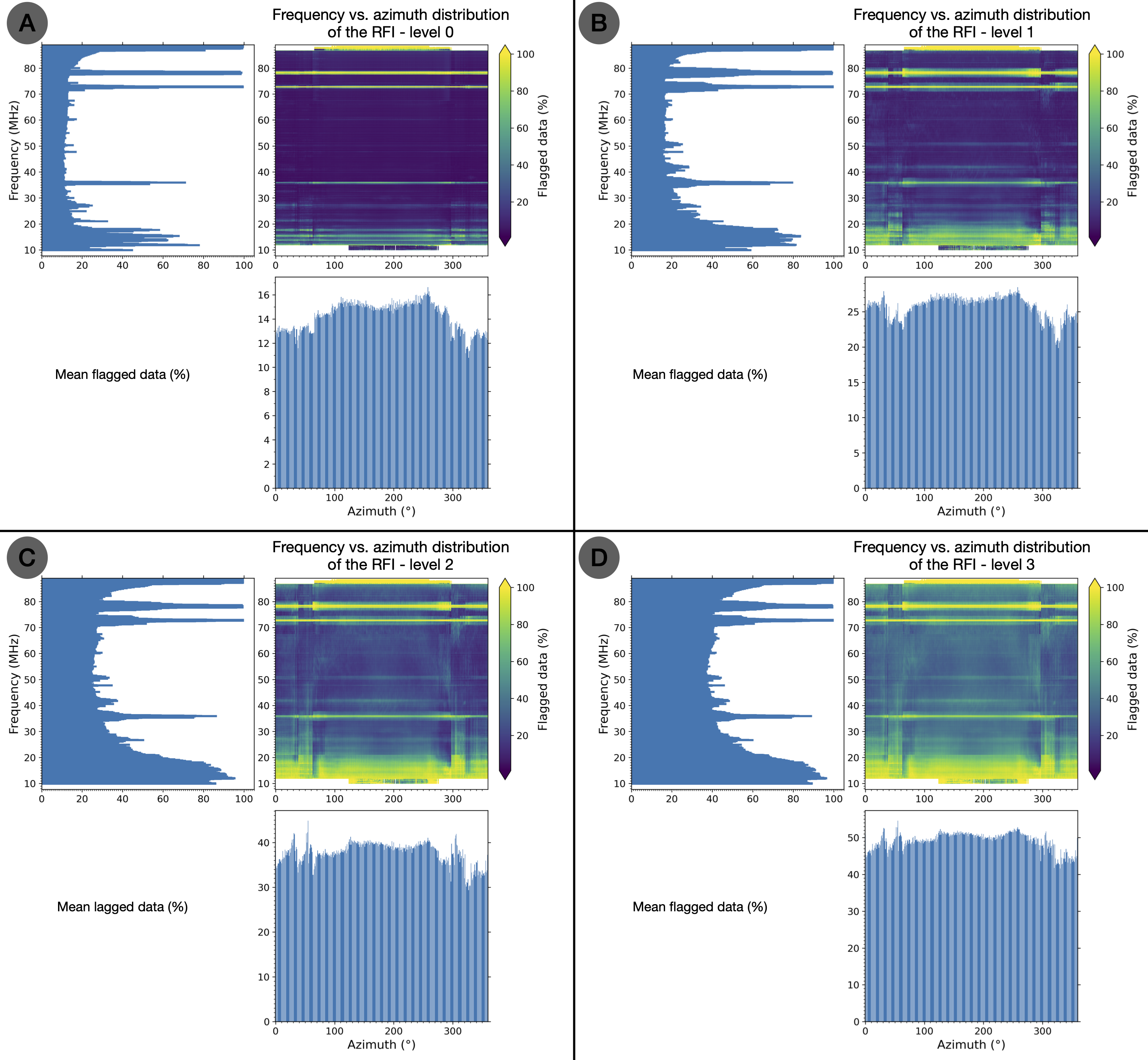 2D frequency vs. Azimuth distributions of RFI for the four different level of RFI mitigation: (A) level 0, (B) level 1, (C) level 2 and (D) level 3. The color bar in these 2D distributions displays the percentage of “flagged data” (100%: all bad pixels; 0%: all good pixels). On the left of each distribution is plotted the mean flagged data per frequency, while the mean flagged data per azimuth is shown below each distribution.