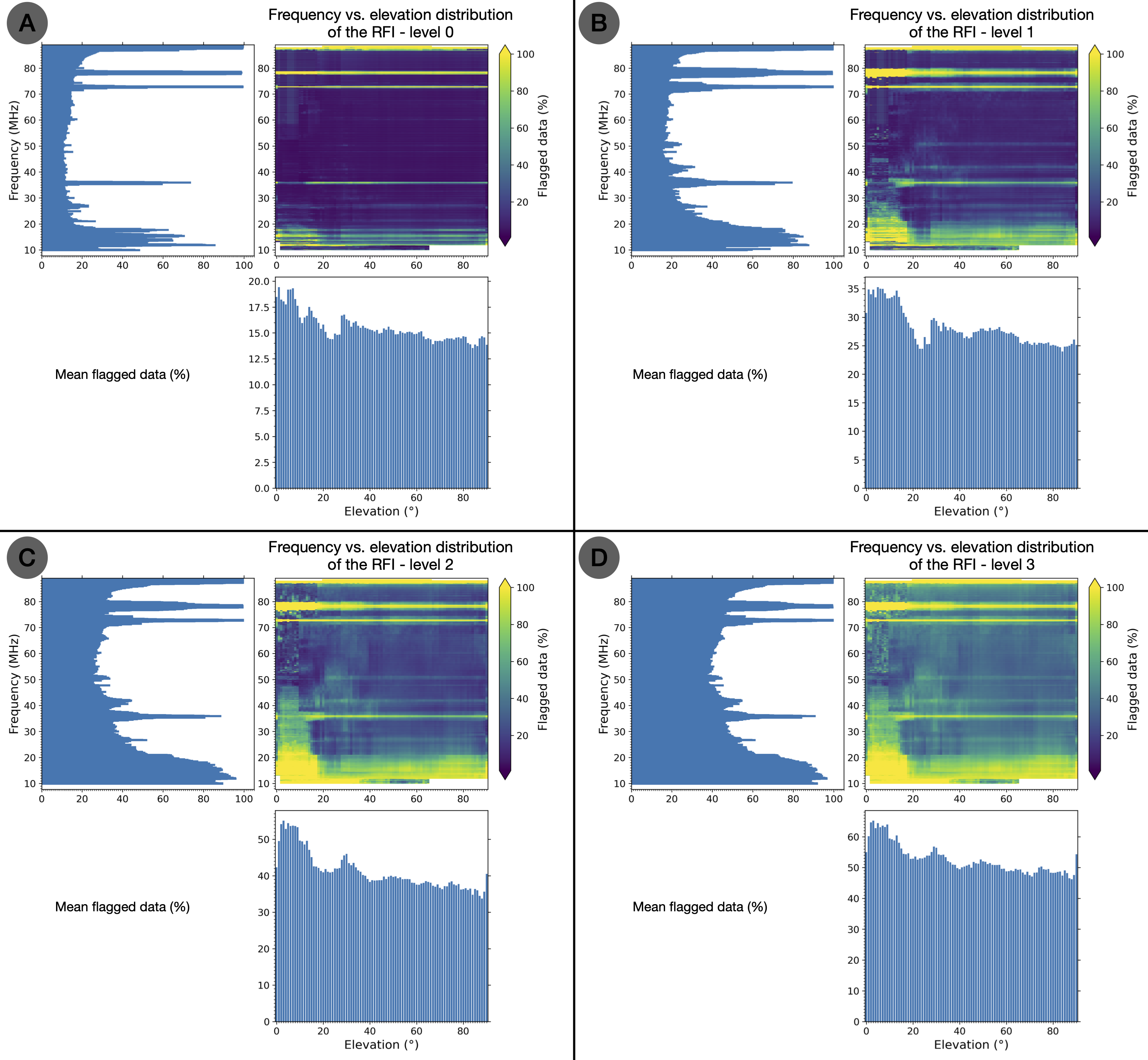 2D frequency vs. Elevation distributions of RFI for the four different level of RFI mitigation: (A) level 0, (B) level 1, (C) level 2 and (D) level 3. The color bar in these 2D distributions displays the percentage of “flagged data” (100%: all bad pixels; 0%: all good pixels). On the left of each distribution is plotted the mean flagged data per frequency, while the mean flagged data per elevation is shown below each distribution.