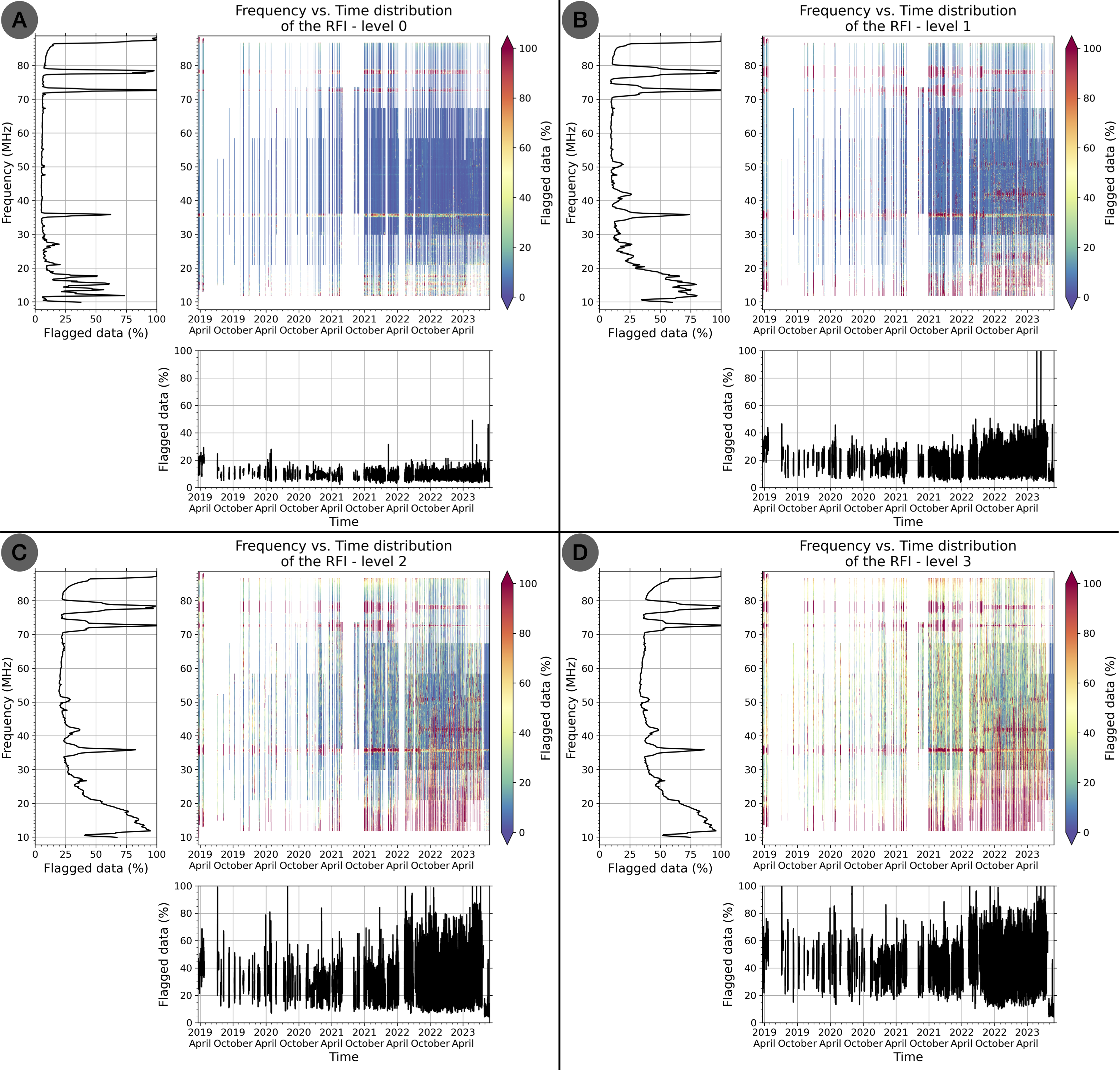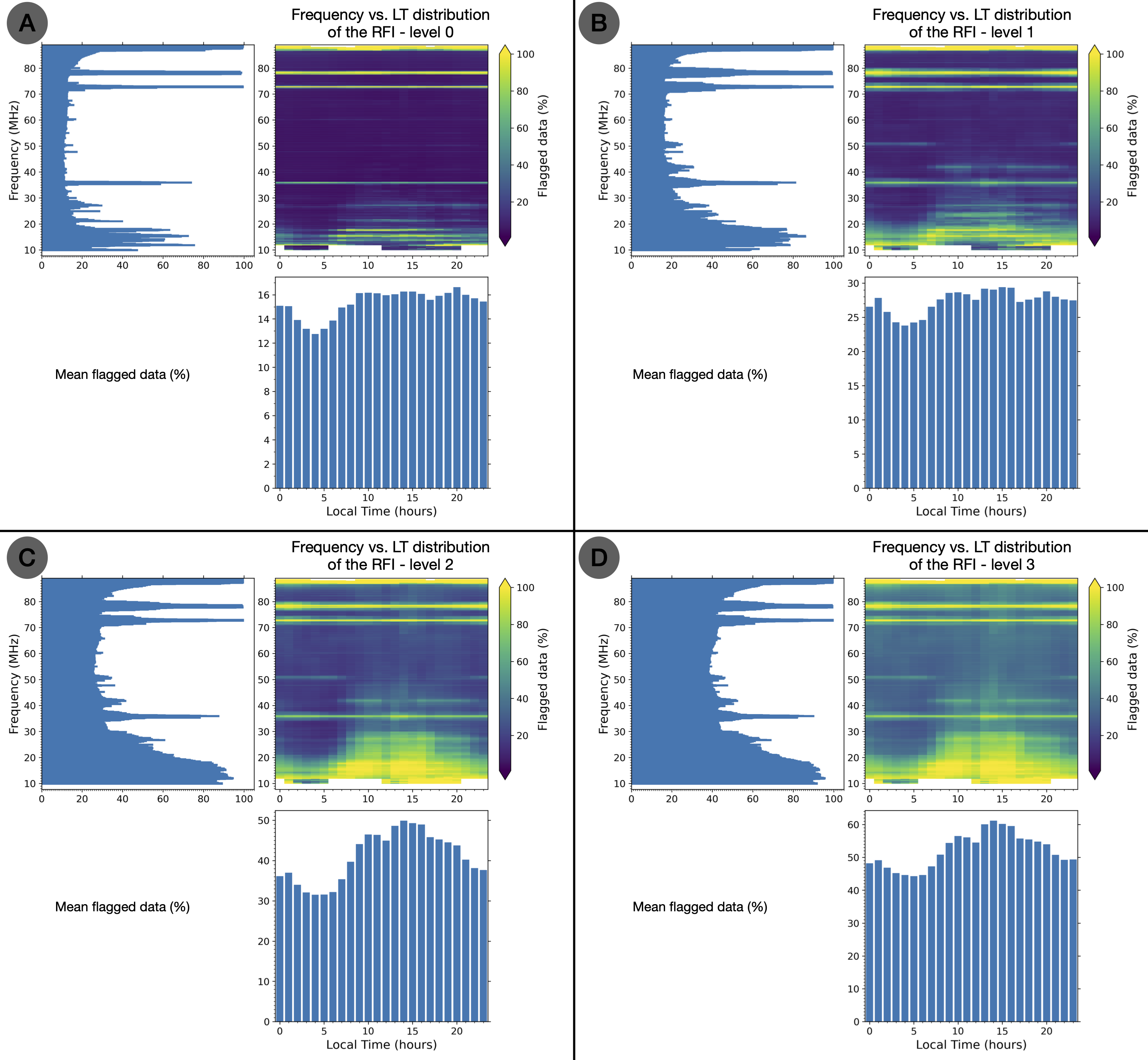 2D frequency vs. Local Time distributions of RFI for the four different level of RFI mitigation: (A) level 0, (B) level 1, (C) level 2 and (D) level 3. The color bar in these 2D distributions displays the percentage of “flagged data” (100%: all bad pixels; 0%: all good pixels). On the left of each distribution is plotted the mean flagged data per frequency, while the mean flagged data per Local Time is shown below each distribution.